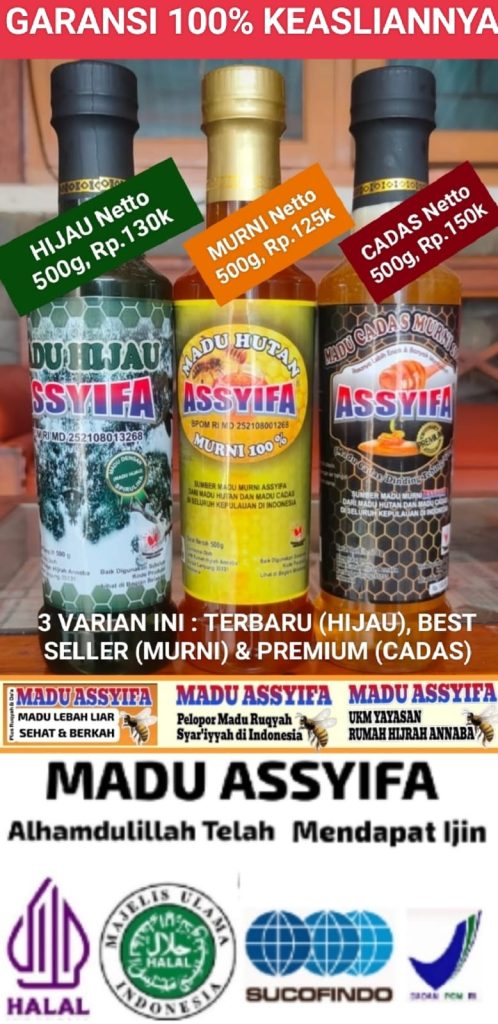 Madu ASSYIFA, selain sumber madunya madu hutan asli, juga dibacakan ayat-ayat ruqyah syar’iyah dan doa saat mengemasnya, in syaa Allah lebih berkah, lebih sehat dan banyak manfaatnya. Alhamdulillah juga sebagian keuntungan usaha ini untuk pemberantasan buta huruf al quran usia dewasa dan lansia. ADA VARIAN : Madu Propolis, Madu Murni, Madu Hitam Pahit dan Madu Untuk Anak/For Kids
